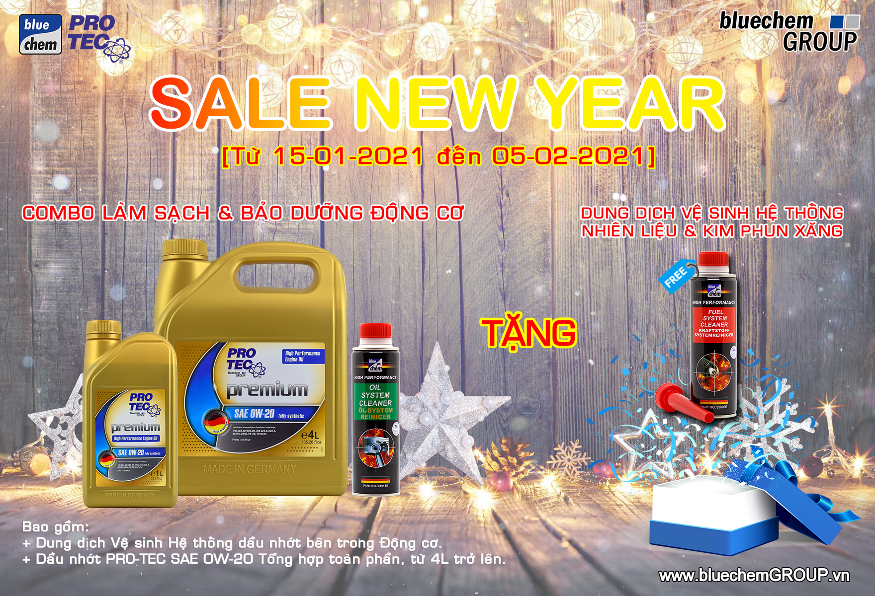 Chào đón mùa chăm sóc "xế yêu" cuối năm và đón mừng năm mới 2021, Xuân Tân Sửu. Đồng thời cũng là dịp tri ân Quý Khách hàng đã luôn tin dùng các sản phẩm phụ gia và dầu nhớt của bluechemGROUP Việt Nam trong suốt thời gian vừa qua, chúng tôi xin trân trọng gửi đến Quý Khách hàng chương trình Lễ hội khuyến mãi "SALE NEW YEAR 2021", nội dung chương trình chi tiết như sau: